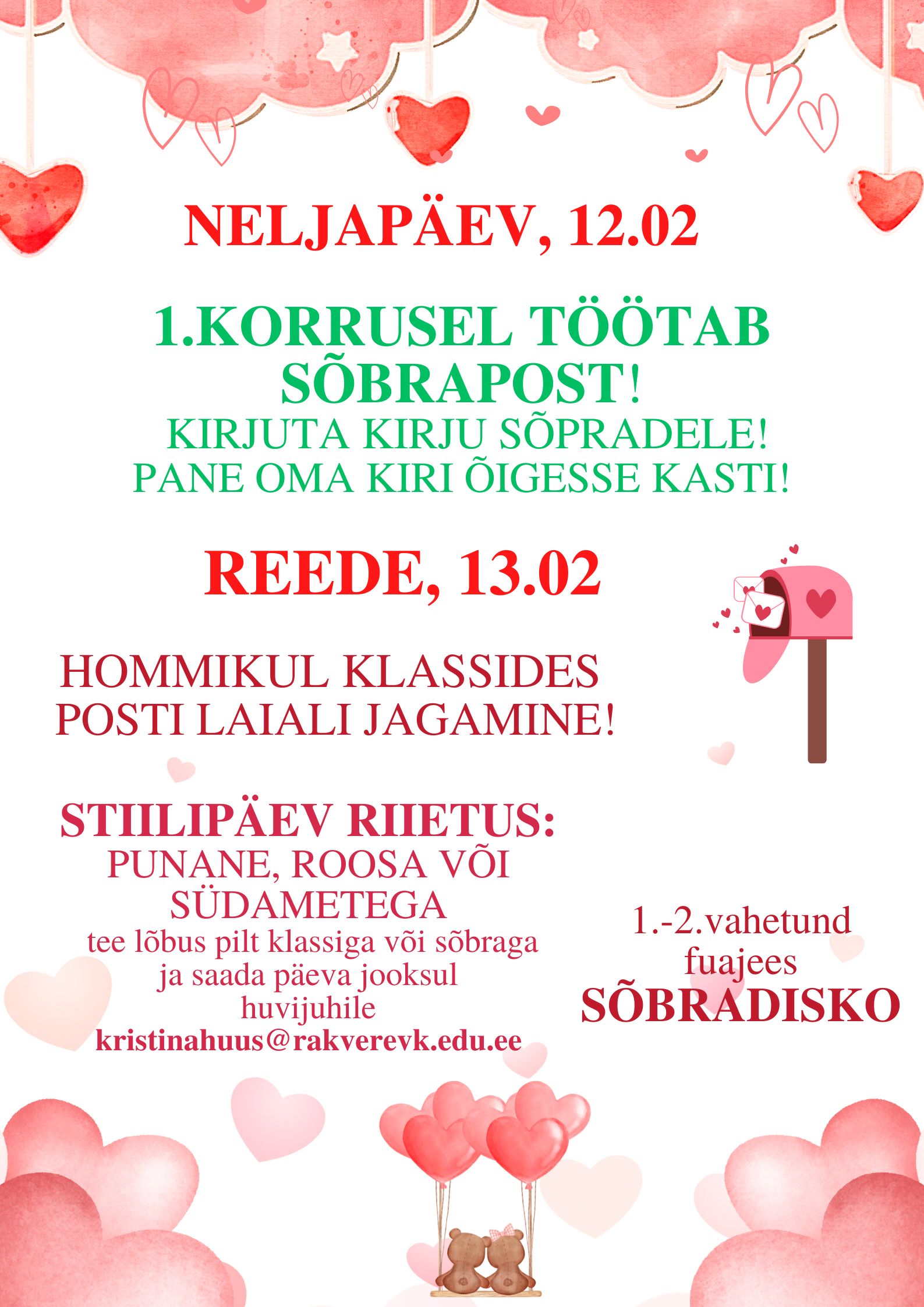 Sõbranädalal toimus mitmesuguseid vahvaid sõbralikke tegevusi. Hommikul ootas saabujaid kommikorv, jagati poolikuid südameid südamemänguks, mis seisnes selles, et päeva jooksul oli vaja leida oma südame teine pool. Lisaks sellele töötasid fotonurk ja sõbrakohvikud. Vabaduse majas toimus sel aastal esmakordselt minipannkookide küpsetamine kohapeal. Kohvikuid pidasid 7.B ja 9.A.